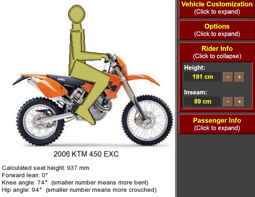 Spre deosebire de bicicleta unde poti sa-ti comanzi cadrul dupa inaltime, la mobrele de motocross-hardenduro cam toate sunt de la aceiasi mama, plus, minus cativa centimetri in lungimea cadrului. Poti rezolva problema prin ridicarea ghidonului, dar asta nu e o solutie de confort majora. De exemplu KTM 400, 450, 525, 520, 530 au acelasi cadru, ktm 250, 300 la fel, distanta de la scarite la sea cred ca este standard pt toate ktm-urile. La 1,85m ai mei toate mobrele mi s-au parut ok, si pe toate m-am simtit la fel(difera ciclistica de la una la alta,dar asta e alta poveste). Dupa parerea mea, toate scandurile de mobre sunt la fel si pozitia asezat e cam aceiasi la toate.